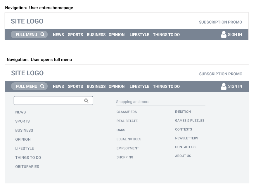 The concept we tested with users involved two displays: A homepage navigation, that offers links to the top-level sections in the site's hierarchy, and a set of links from the story page with a more general set of options.