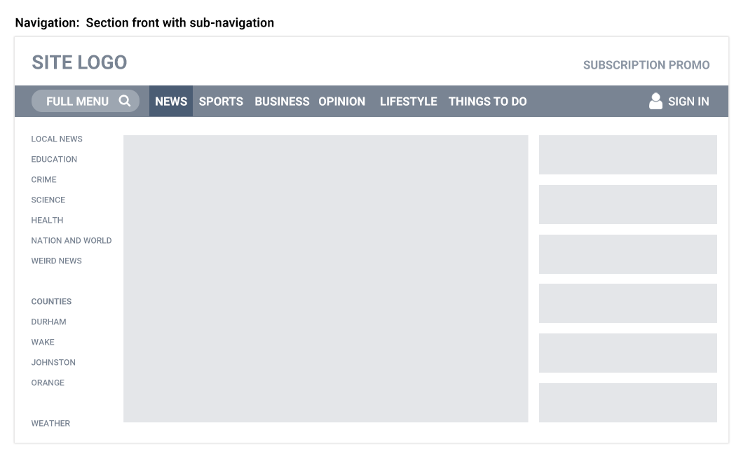- Access to the top-level sections display across the top of the page, where they are most available to users.